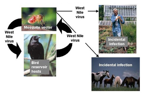 Birds are the natural reservoir for West Nile virus. If a mosquito bites an infected bird and the virus is transmitted to the mosquito, it may then become a host itself. If the same mosquito then bites a human, it can pass the disease to the human. Because of this cycle, noticing dead birds could be the first sign of West Nile Virus in an area.